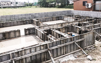 基礎工事捨てコンクリートに描いた線に沿って、基礎部分の鉄筋を組み立てていきます。その後、型枠を設置して、底盤部分にコンクリートを打設して固める一般的なベタ基礎を採用しています。