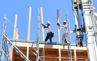 屋根・外壁工事上棟式が終わるとすぐに屋根工事に入り、材料が雨に塗れるのを防ぎます。外部サッシを取り付け、素早く外部工事に入ります。