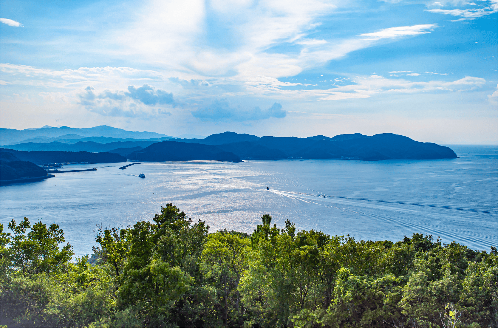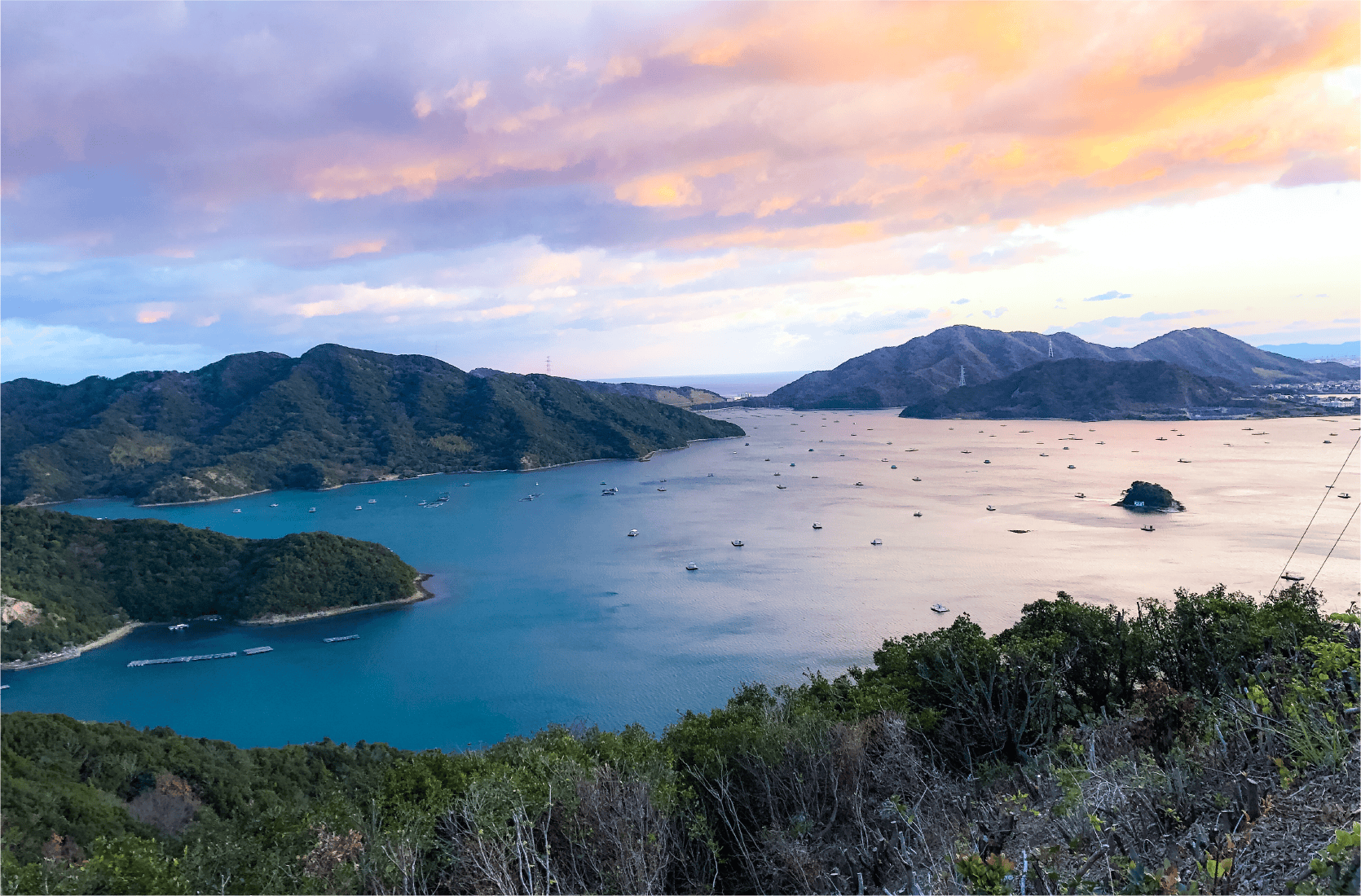 穏やかなウチノ海、多彩な島影、静かな環境に癒されます。ここで飲食店を始める方も結構います。多くの人にこの景色を見てもらいたいのかもしれません。近所には広大な敷地を有するウチノ海総合公園があり、自分の庭よう散策できます。